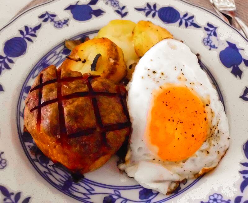 Hackbraten mit Avocado, Kartoffeln und Ei gefüllt